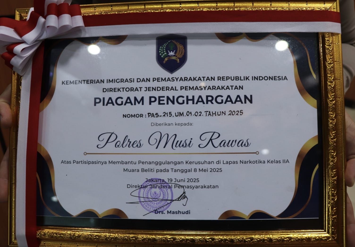 Dan, penghargaan, Dirjen Pemasyarakatan (Dirjenpas) atas partisipasi Polres Musi Rawas dalam membantu penanggulangan kerusuhan di Lembaga Permasyarakatan Narkotika Kelas IIA Muara Beliti.