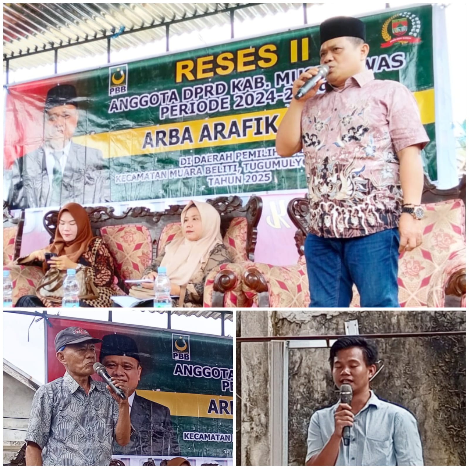 Ulasanrakyat.Com – Musi Rawas. Anggota Dewan Perwakilan Rakyat Daerah (DPRD) Kabupaten Musi Rawas periode 2024–2029 dari Partai Bulan Bintang, Arba Arapik, S.A.P, melaksanakan Reses II tahun 2025 di Daerah Pemilihan (Dapil) Kecamatan Muara Beliti, Tugumulyo, dan Purwodadi. Kegiatan tersebut digelar di kediamannya di Kampung V Desa Suro, Kecamatan Muara Beliti, Minggu (24/08/2025).