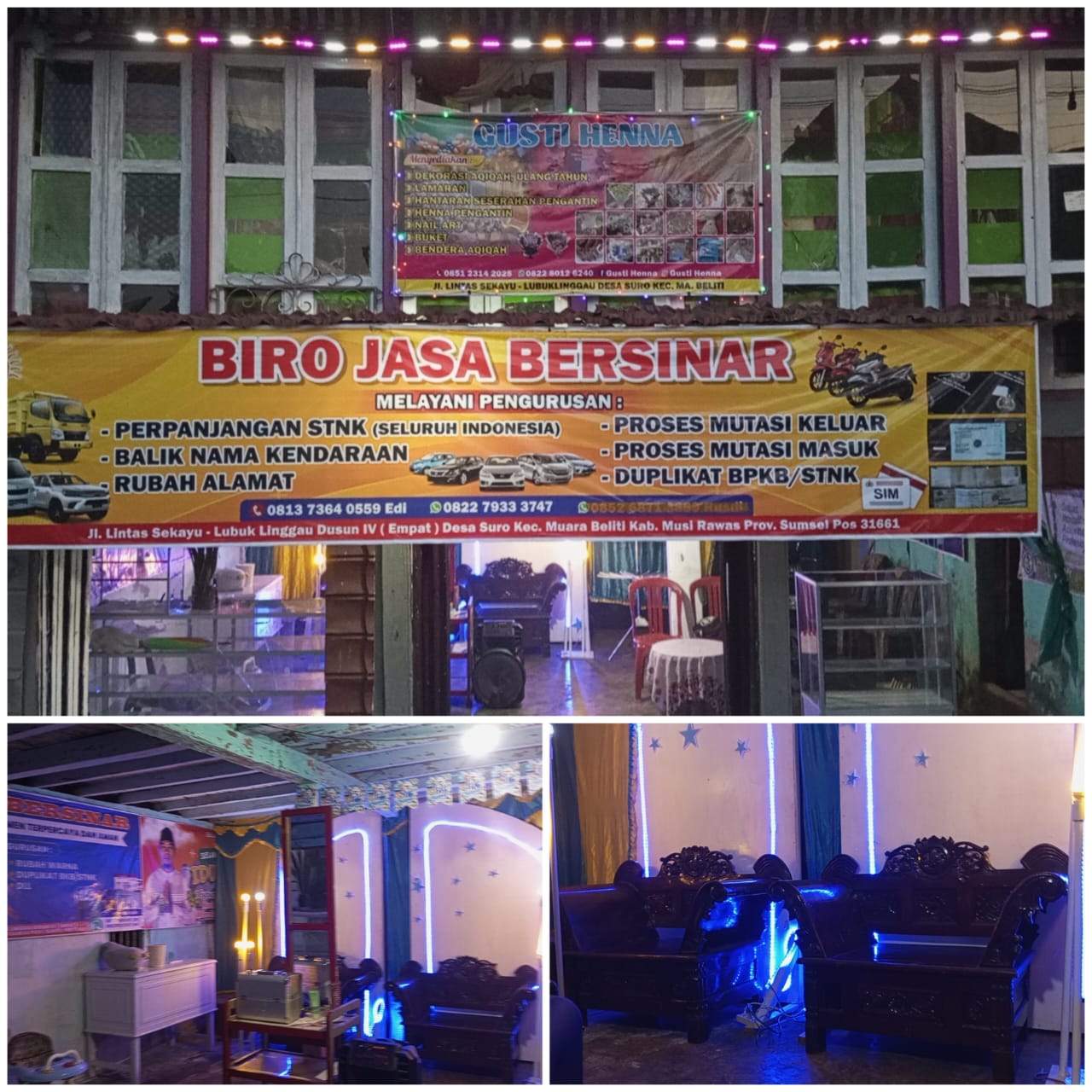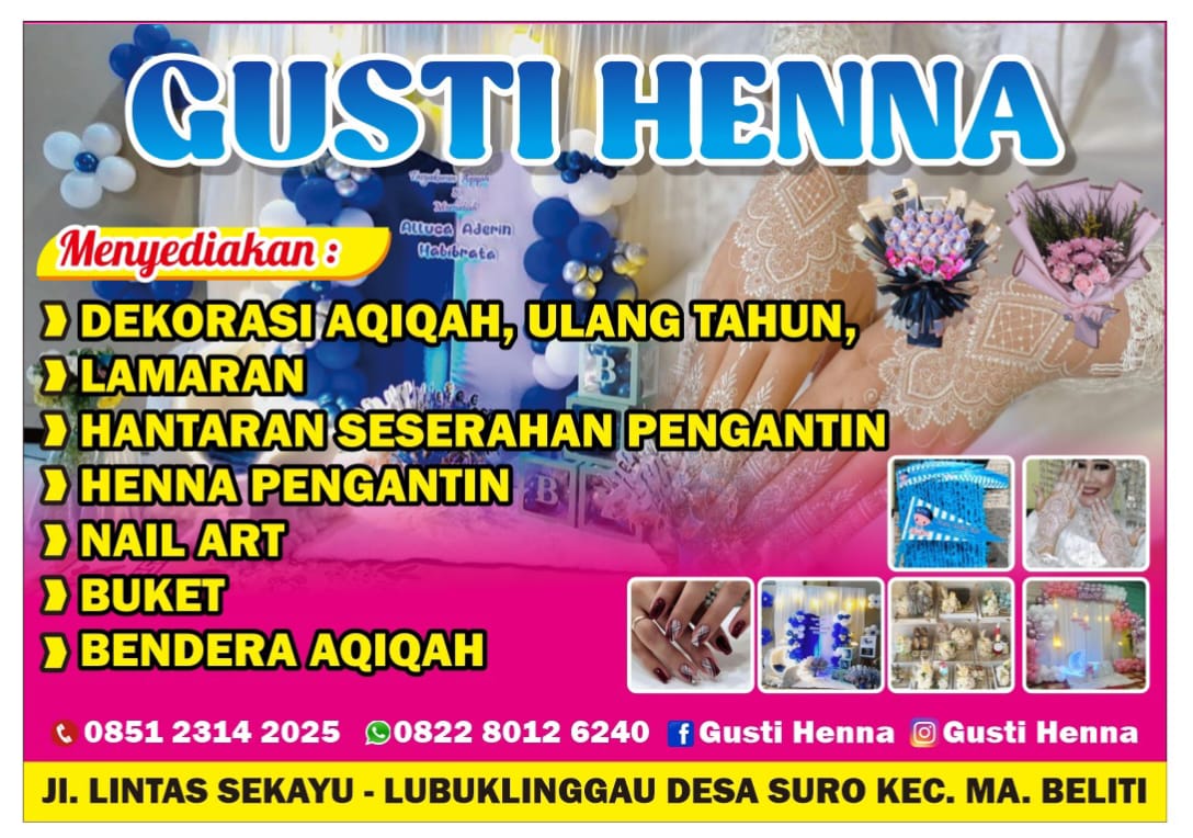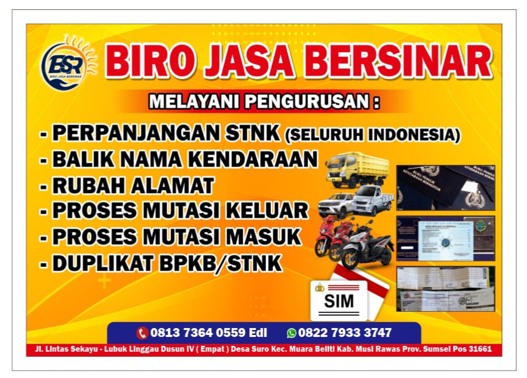 Ulasanrakyat.Com – Musi Rawas. Warga Kabupaten Musi Rawas kini memiliki pilihan baru untuk mengurus berbagai keperluan administrasi kendaraan maupun dekorasi acara. Kehadiran Biro Jasa Bersinar dan Pelaminan Gusti Hanna yang beralamat di Jalan Lintas Sekayu–Lubuklinggau, Dusun IV, Desa Suro, Kecamatan Muara Beliti, Kabupaten Musi Rawas, Provinsi Sumatera Selatan, Pos 31661 menjadi jawaban bagi masyarakat yang mendambakan pelayanan profesional, cepat, dan terpercaya.