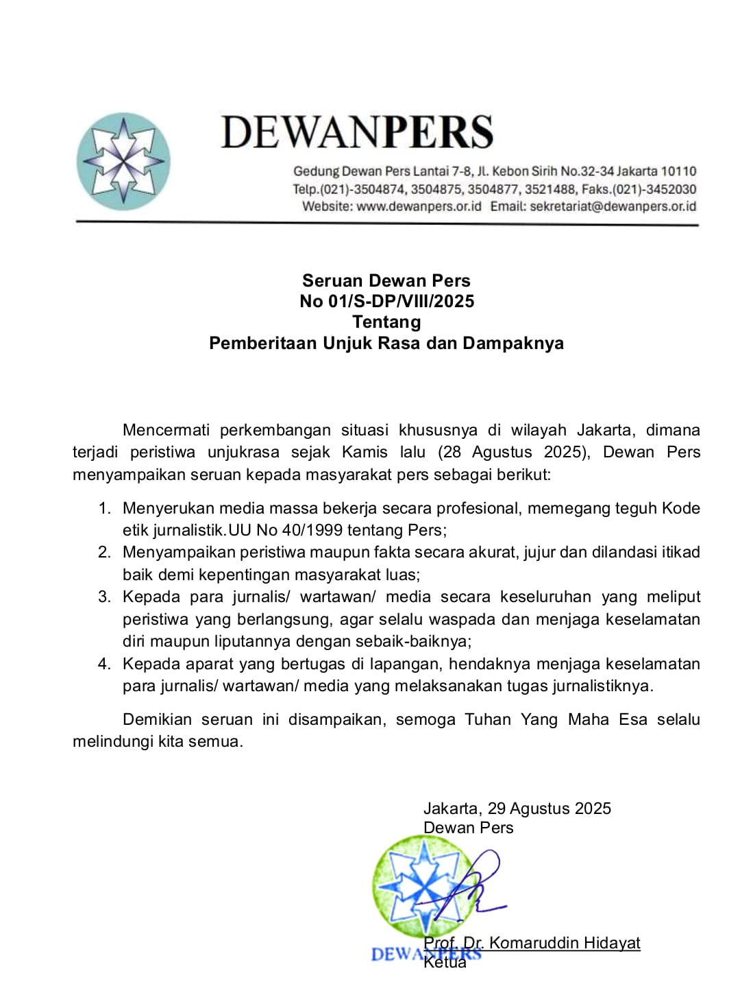 Ulasanrakyat.Com – Jakarta, Dewan Pers kembali menyerukan pentingnya peran pers dalam menjaga kualitas demokrasi melalui pemberitaan yang akurat, jujur, dan berimbang. Ketua Dewan Pers, Prof. Dr. Komaruddin Hidayat, menandatangani seruan resmi agar seluruh insan pers, baik media massa maupun jurnalis, tetap berpegang pada Kode Etik Jurnalistik serta Undang-Undang Nomor 40 Tahun 1999 tentang Pers. Jumat, (29/09/2025).