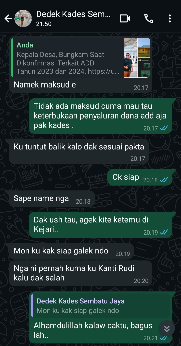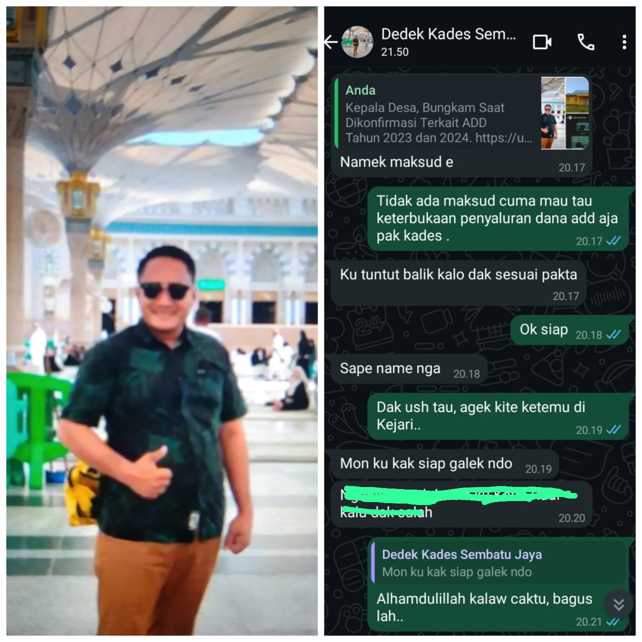 Sementara itu sebelumnya diberitakan, Kepala desa Sembatu Jaya ini dikonfirmasi terkait kegiatan desa yang menggunakan anggaran desa tahun 2023, namun yang bersangkutan berapa kali dihubungi melalui WhatsApp tidak memberikan respon alias bungkam. Tapi setelah berita ini ditayangkan, malah bersangkutan marah dan terkesan menantang serta mengancam wartawan.(Red)