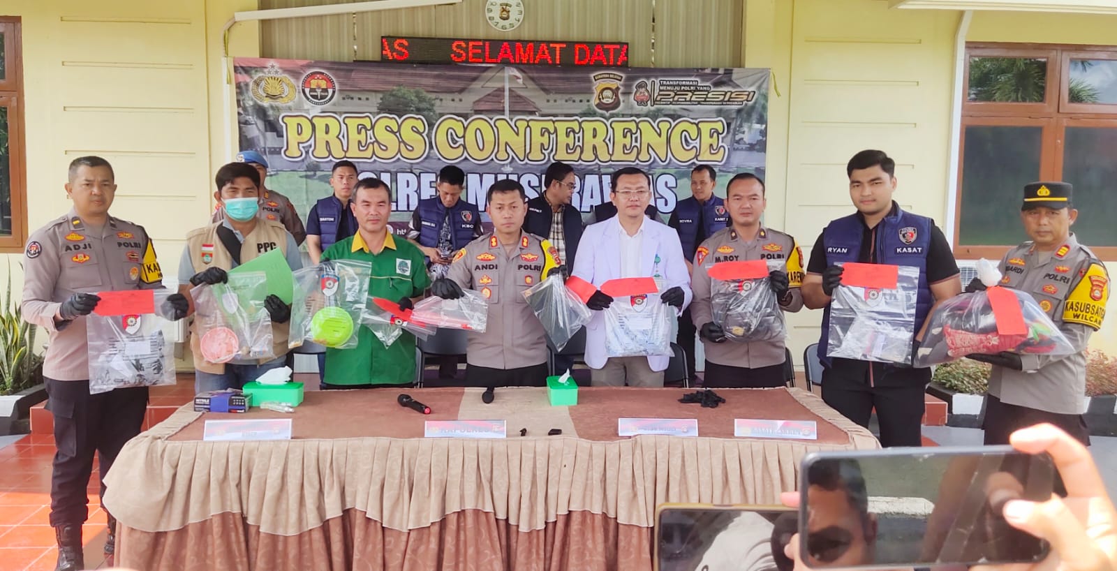 Saat pelaksanaan Press Conference, dihadiri juga, Kepala RSUD dr Sobirin Muara Beliti, dr. H. Sopyan Hadi, Sp.B., FCSI, perwakilan Dinas Lingkungan Hidup (DLH), Kabupaten Mura, beserta Unit Reskrim Polsek Muara Beliti.