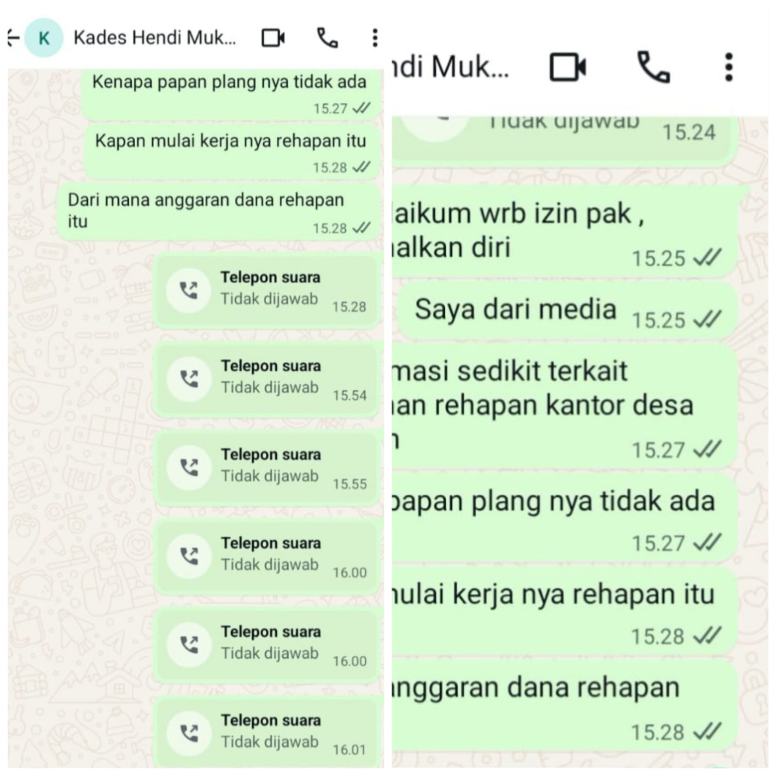 Tak puas dengan keterangan para pekerja, tim awak media mencoba menghubungi Kepala Desa G1 Mataram untuk meminta klarifikasi. Sayangnya, upaya konfirmasi berulang kali tidak membuahkan hasil. Nomor WhatsApp kepala desa aktif, pesan WhatsApp juga tidak diterbaca pada hal centang dua, dan panggilan telepon pun tidak diangkat.