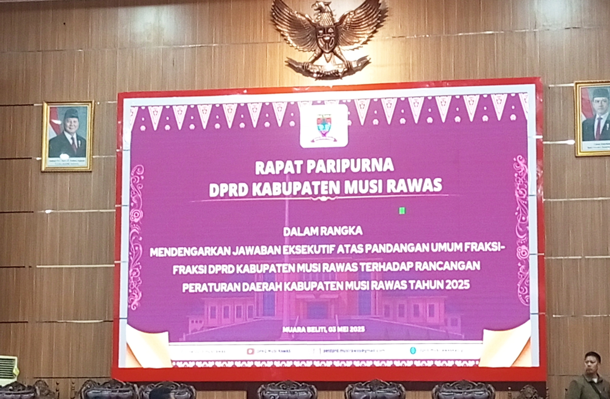 Dewan Perwakilan Rakyat Daerah (DPRD) Kabupaten Musi Rawas menggelar Rapat Paripurna dalam rangka mendengarkan jawaban eksekutif terhadap pemandangan umum fraksi-fraksi DPRD atas empat Rancangan Peraturan Daerah (Raperda), Sabtu (03/05/2025), bertempat di ruang rapat paripurna DPRD Kabupaten Musi Rawas.