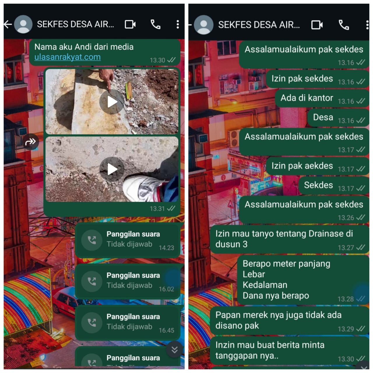 Sikap tidak kooperatif ini menimbulkan pertanyaan besar, ada apa dengan Pemerintah Desa Air Lesing, Kenapa enggan terbuka terhadap konfirmasi publik, terutama terkait proyek infrastruktur yang menggunakan anggaran negara.