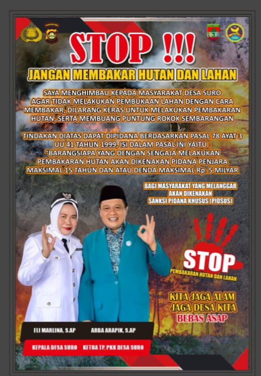 Melalui Kepala Desa, Eli Marlina, S.AP., Pemerintah Desa Suro menyampaikan imbauan keras untuk menghentikan segala bentuk aktivitas pembakaran hutan dan lahan, termasuk pembukaan lahan dengan cara dibakar serta membuang puntung rokok sembarangan.