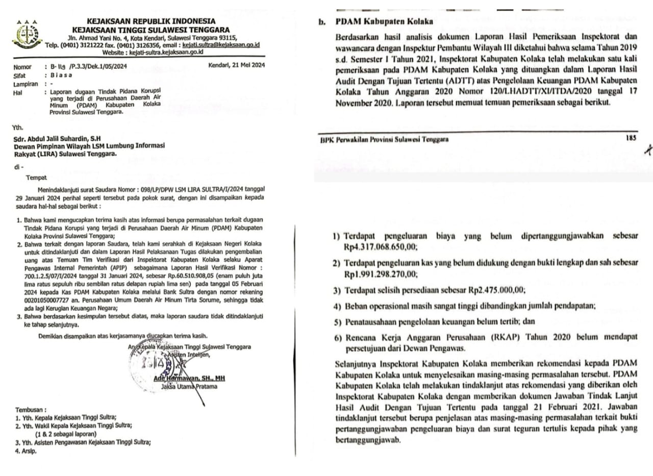 Direktur Eksekutif Jasbaru Sultra, Manton mengatakan bahwa pihaknya telah melaporkan kasus dugaan korupsi di lingkup PDAM Kolaka pada Bulan Januari 2024 lalu, dengan Nomor : 098/LP/DPW LSM LIRA SULTRA/I/2024, di Kejaksaan Tinggi Sulawesi Tenggara, yang kemudian laporan tersebut dilimpahkan ke Kejaksaan Negeri Kolaka.