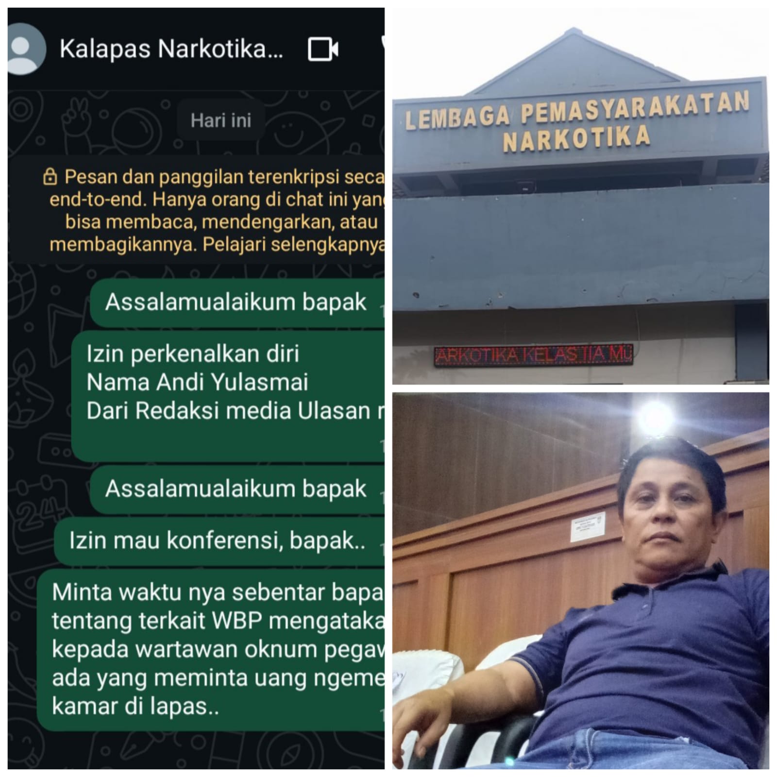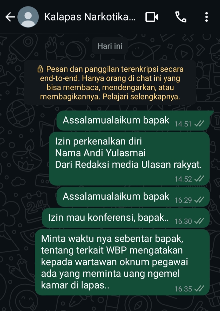 “Assalamualaikum bapak, izin memperkenalkan diri… ingin konfirmasi terkait informasi dari warga binaan soal dugaan pungli oleh oknum petugas,” tulis Andi dalam pesan WhatsApp yang dikirim ke Kepala Lapas.
