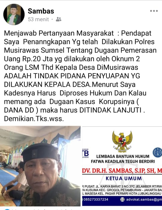 Ulasanrakyat.Com – Sumatera Selatan Musi Rawas. Ketua Umum Lembaga Bantuan Hukum (LBH) DV, Drh. Sambas, S.IP, SH, MH, angkat bicara soal viralnya pemberitaan penangkapan dua oknum LSM yang diduga melakukan pemerasan terhadap kepala desa di Kabupaten Musi Rawas. Melalui media sosial Facebook, Sambas menyatakan bahwa kasus ini tidak bisa hanya dilihat dari satu sisi.