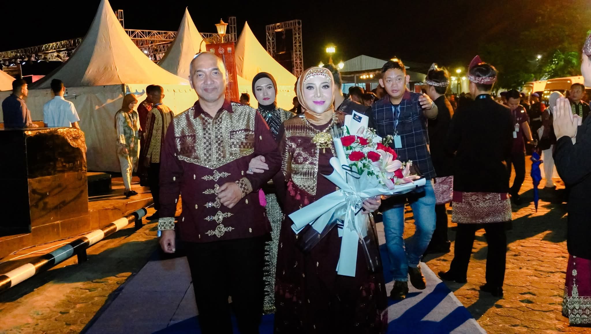 Dampingi Ketua TP PKK Musi Rawas, H. Riza Novianto Gustam, Bupati Ratna melangkah dengan penuh percaya diri dan wibawa, mengenakan wastra khas Musi Rawas yang ditata elegan namun tetap memegang nilai-nilai tradisional.