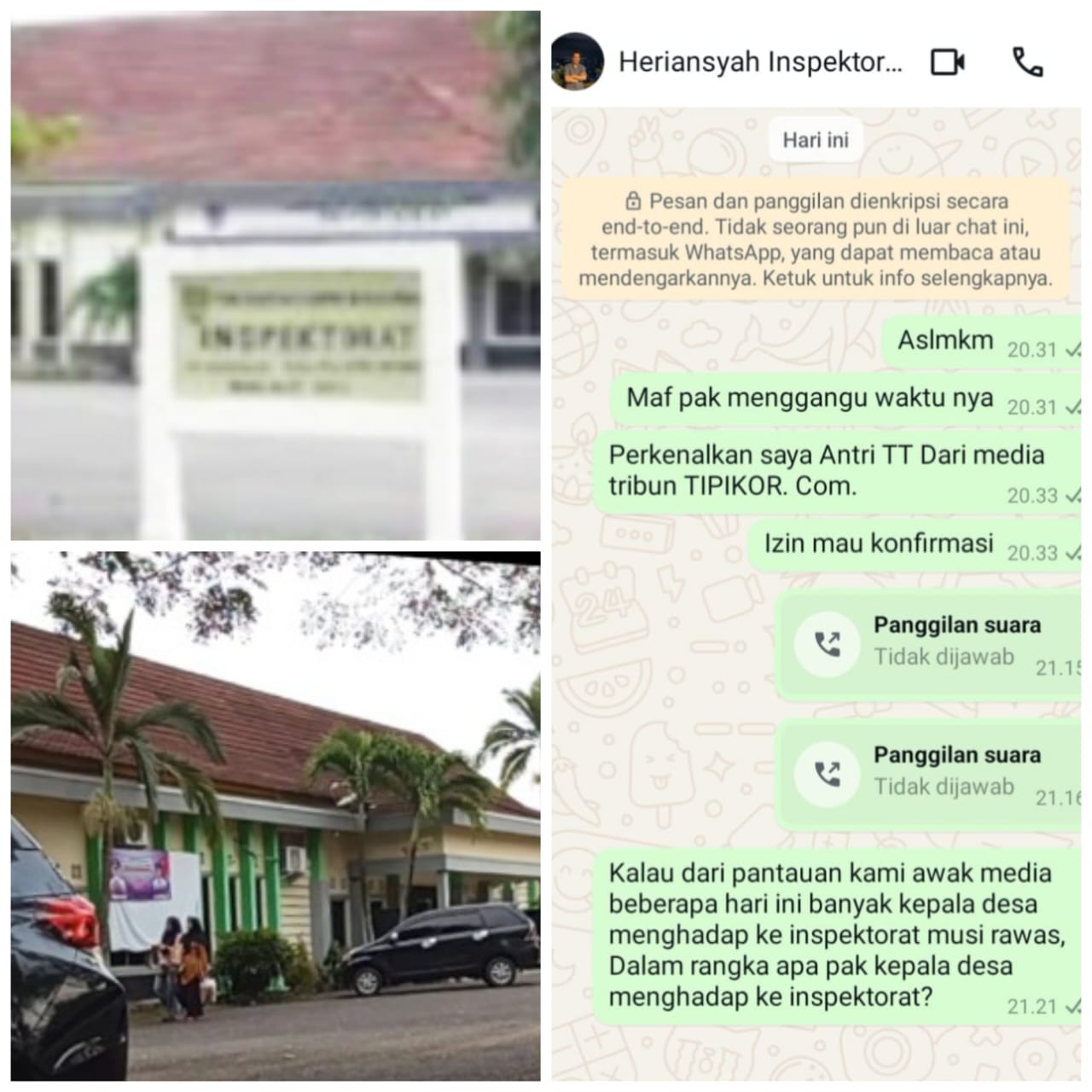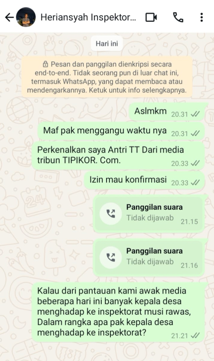 Untuk membuat berita yang Berimbang awak media mencoba konfirmasi kepada Heriansyah selaku kepala Inspektur kabupaten Musi Rawas melalui via whatsap namun sampai berita ini di tayangkan belum ada jawaban dan tanggapan dari kepala Inspektur Mura.