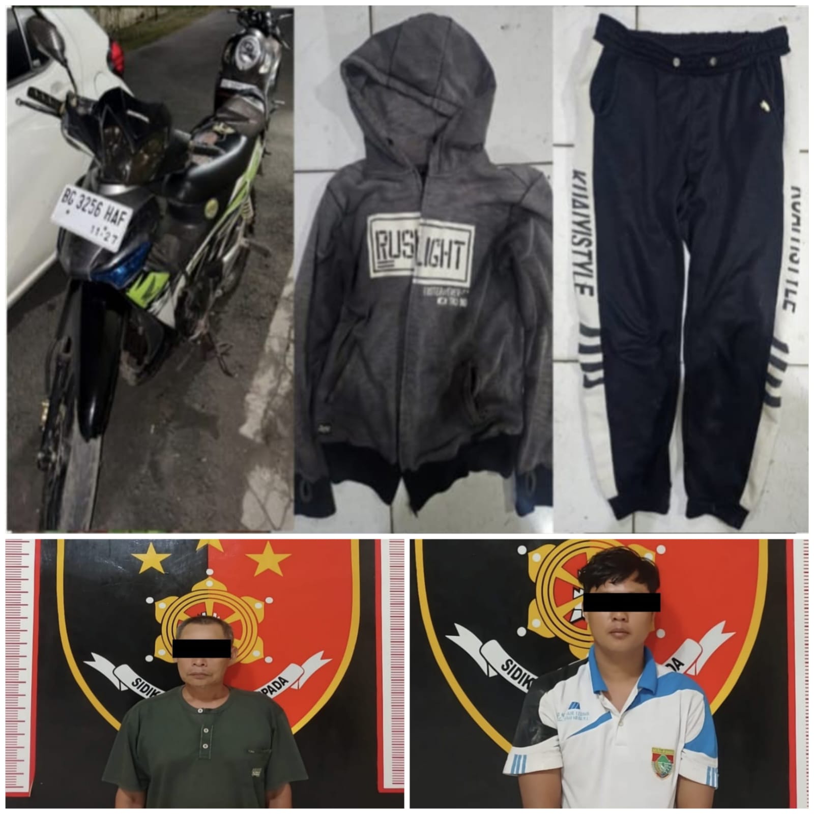 “Selain tersangka, personel juga menyita BB diantaranya, satu unit Hp merk Infinix Smart 6 warna Midnight Black, satu buah kotak handhone merk Infinix Smart 6 warna Hijau, satu unit sepeda motor merk Honda Revo warna hitam Hijau dengan nomor Polisi BG-3256-HAF, satu helai jaket Hodie warna abu-abu dengan merk RUSHLIGHT dan satu helai celana joger warna hitam putih yang bertuliskan KUAIYISTYLE,” akhirnya