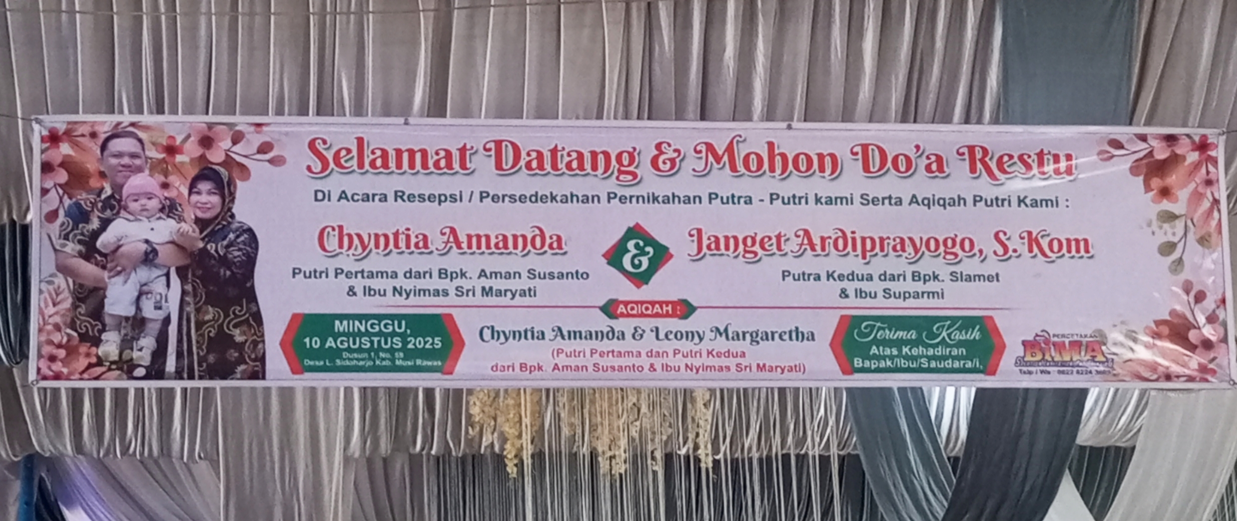Ulasanrakyat.Com – Musi Rawas. Raut bahagia terpancar dari wajah pasangan pengantin Chyntia Amanda Putri, putri sulung pasangan Aman Susanto dan Nyimas Sri Maryati, serta Janget Ardiprayogo, S.Kom, putra kedua pasangan Slamet dan Suparmi. Resepsi pernikahan keduanya digelar meriah pada Minggu (10/08/2025) di Dusun 1, Desa L Sidoharjo, Kecamatan Tugumulyo, Kabupaten Musi Rawas.