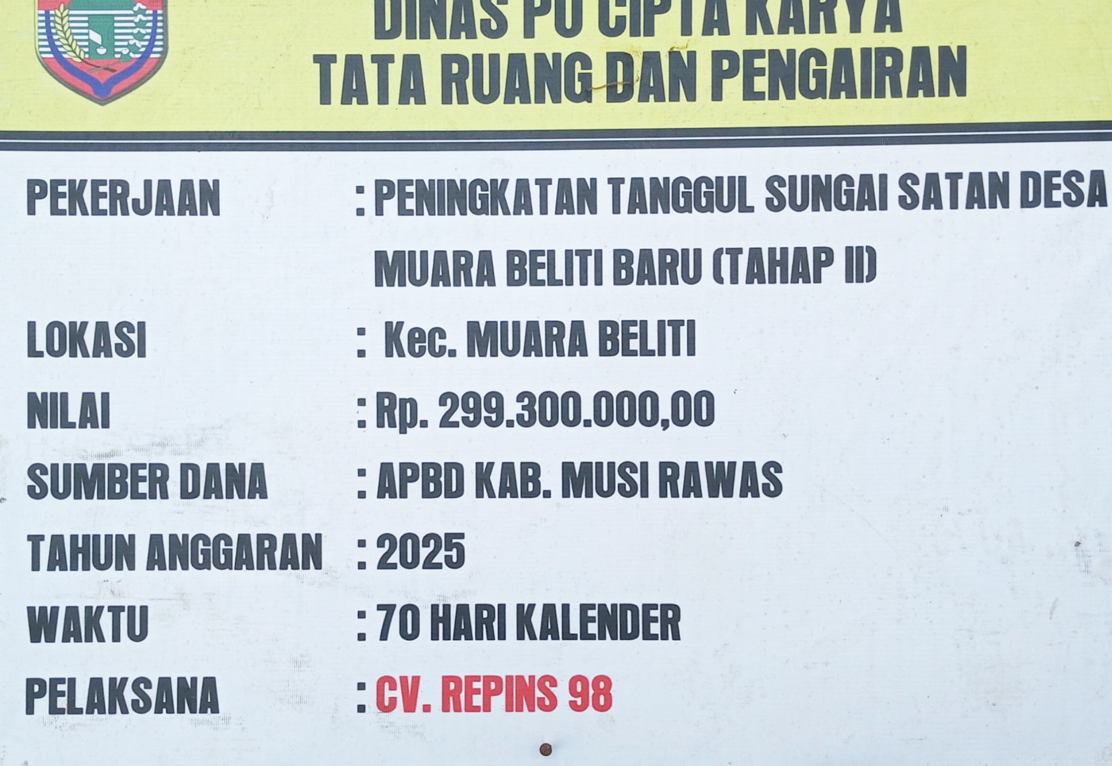 Ulasan rakyat Com – Musi Rawas. Pekerjaan peningkatan Tanggul Sungai Satan Tahap II yang dilaksanakan oleh Dinas Pekerjaan Umum Cipta Karya Tata Ruang dan Pengairan Kabupaten Musi Rawas di Desa Muara Beliti Baru, Kecamatan Muara Beliti, mulai menuai sorotan publik. Proyek yang bersumber dari APBD Kabupaten Musi Rawas Tahun Anggaran 2025 dengan nilai Rp. 299.300.000 tersebut dinilai dikerjakan secara terburu-buru dan berpotensi minim asas manfaat.