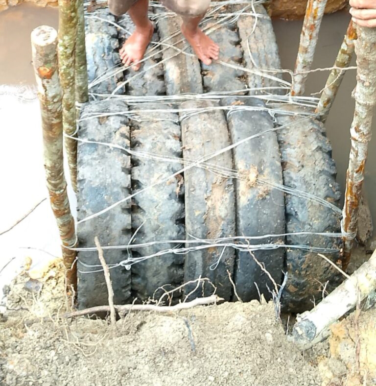 Proses pembuatan gorong gorong dari ban bekas untuk memudahkan akses masyarakat melintas .(Foto istimewa)