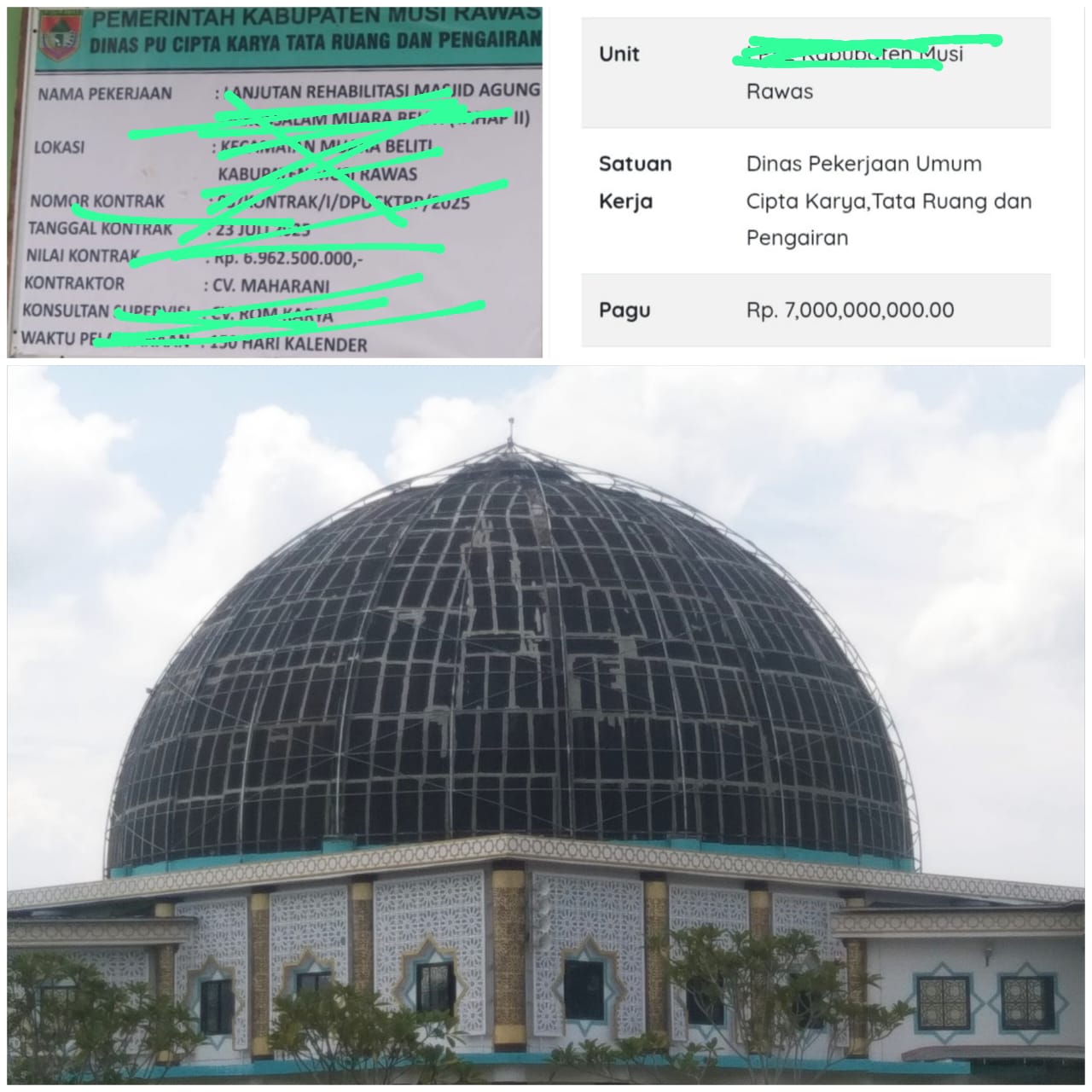 Ulasanrakyat.Com – Musi Rawas. Proyek rehabilitasi lanjutan Masjid Agung Darussalam Muara Beliti Baru, Kecamatan Muara Beliti, Kabupaten Musi Rawas, yang menelan anggaran Rp 6.962.500.000 dari APBD Tahun Anggaran 2025, kini menuai sorotan tajam. Alih-alih memberikan wajah baru bagi ikon religi masyarakat Musi Rawas, proyek bernilai miliaran rupiah tersebut justru diduga kuat hanya dijadikan ajang bancakan oleh oknum yang tak bertanggung jawab.