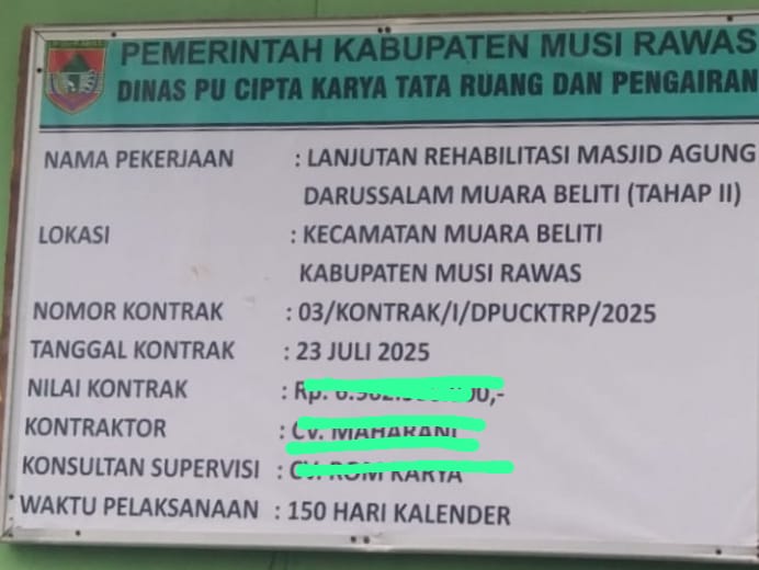 Ulasanrakyat.Com – Musi Rawas. Proyek rehabilitasi lanjutan Masjid Agung Darussalam Muara Beliti Baru, Kecamatan Muara Beliti, Kabupaten Musi Rawas, yang menelan anggaran Rp 6.962.500.000 dari APBD Tahun Anggaran 2025, kini menuai sorotan tajam. Alih-alih memberikan wajah baru bagi ikon religi masyarakat Musi Rawas, proyek bernilai miliaran rupiah tersebut justru diduga kuat hanya dijadikan ajang bancakan oleh oknum yang tak bertanggung jawab.