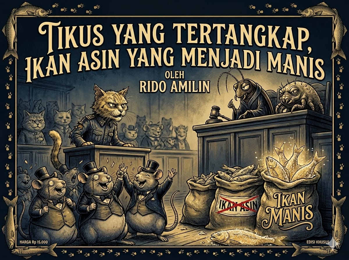 ”Karena barang bukti yang diajukan adalah ‘Ikan Asin’, sedangkan yang ada di hadapan kami adalah ‘Ikan Manis’, maka demi hukum, tuntutan ini batal,” ketok Hakim Lipas dengan palu kayunya yang kecil. “Tikus-tikus ini tidak bersalah. Mereka hanya membawa manisan untuk pesta keluarga.”