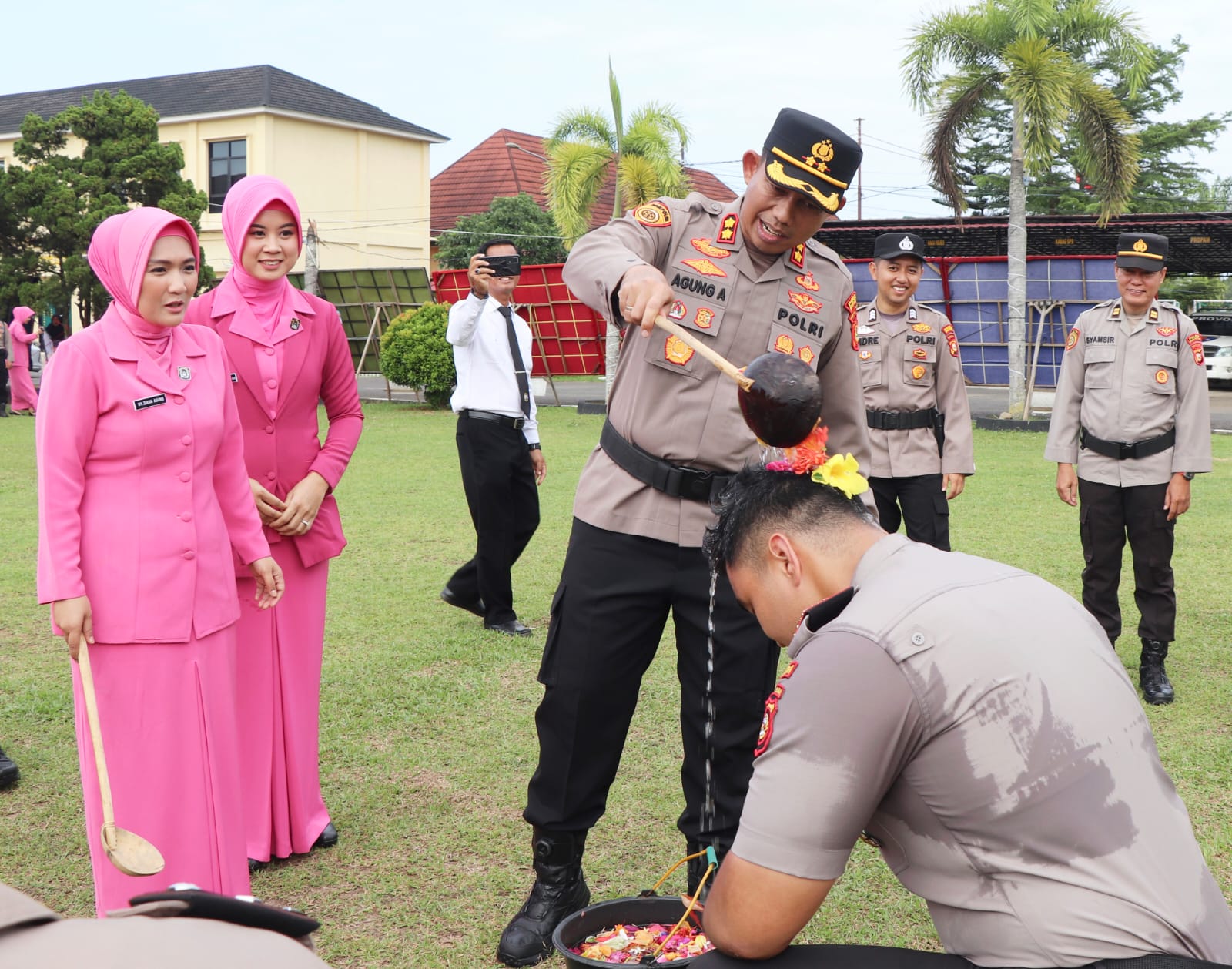 Usai pelaksanaan upacara kenaikan pangkat, dilanjutkan tradisi mandi kembang dilakukan langsung oleh Kapolres Mura, AKBP Agung Adhitya Prananta SH, SIK, MH, dan Wakapolres, Kompol Hendri SH, beserta Ketua Bhayangkari Cabang Mura, Ny Diana Agung dan Wakil Ketua Bhayangkari Cabang Mura, Ny Dian Hendri, kepada personel yang naik pangkat.