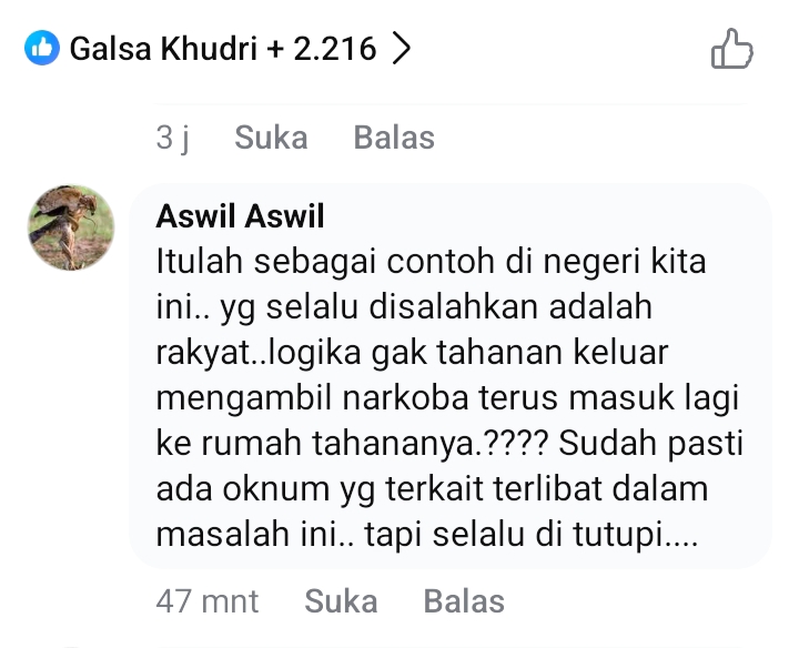 “Pasti orang dalam yang berperan meloloskan semuanya. Saya tahu karena saya pernah mengalami. Yang bawah jadi tumbal, napi jadi korban. Kalau memang mau benar, jadikan napi benar-benar dihukum sesuai kesalahan.”ungkapnya dalam komentar.